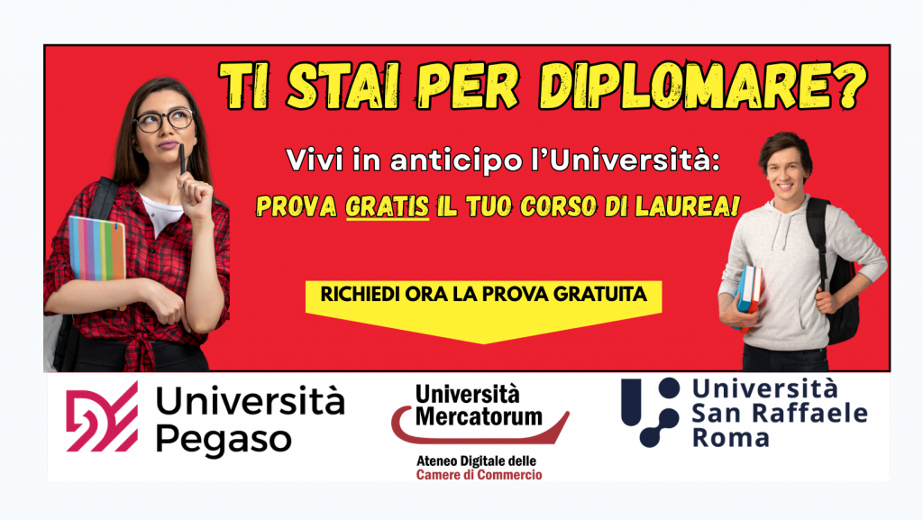 Inizia a provare gratuitamente l’Università prima del diploma. Vai ancora alle scuole superiori? Stai per conseguire il diploma? Con le Università digitali UniPegaso, UniMercatorum e San Raffaele Roma puoi vivere in anticipo l’esperienza dell’Università, subito e gratis! Ecco come funziona l’iniziativa a te riservata: Anche se frequenti ancora l’ultimo anno delle superiori e non sei diplomato, puoi iniziare a […]